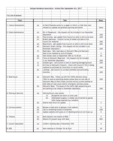 Gallops Residents Association – Action Plan September 2017 Posted on September 10, 2017September 26, 2017 by Julie Here you can see the full list of actions, which were discussed at our last meeting on September 6th. To enlarge or download the action plan as pdf, please click the image below. Share this:Tweet Click to email a link to a friend (Opens in new window) Email Click to print (Opens in new window) Print Click to share on WhatsApp (Opens in new window) WhatsApp Like Loading... Related