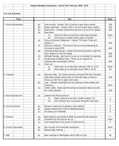 Gallops Residents Association – Action Plan February 2018 Posted on March 14, 2018 by Julie Here you can see the full list of actions, which were discussed at our last meeting on February 28th. To enlarge or download the action plan as pdf, please click the image below. Share this:Tweet Click to email a link to a friend (Opens in new window) Email Click to print (Opens in new window) Print Click to share on WhatsApp (Opens in new window) WhatsApp Like Loading... Related