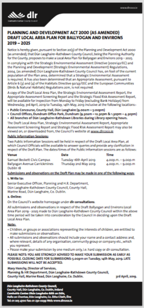 Also submissions and observations on this Draft LAP are now invited for the 6 week period up to 5pm on Tuesday 14th May. Submissions may be made in writing, or online at https://www.dlrcoco.ie/en/planning/local-area-plans/ballyogan-and-environs-lap