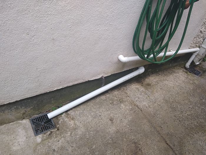 I called the builder who initially built the extension and asked him to come out next time he’s in the area. A few days later he came by, inspected the pipes and told me that the top one was actually the overflow from the boiler, so there was no need to move that one. The bottom one is the outlet of our washing machine, sink and dishwasher, he literally just removed it without any tools and moved it to the correct drain – 2 minutes and job done! I could have done that myself, but it was good that he was out as I didn’t know the difference between the two pipes.