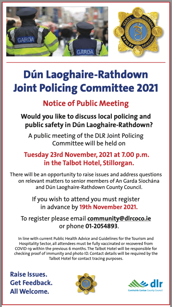 Joint Policing Committee Public Meeting 23rd November 2021 in Stillorgan Posted on November 10, 2021 by Julie Dun Laoghaire-Rathdown Joint Policing Committee Public Meeting is scheduled to take place on the 23rd November at 7.00 p.m. in the Talbot Hotel, Stillorgan. Everybody is welcome to attend. Share this:Tweet Click to email a link to a friend (Opens in new window) Email Click to print (Opens in new window) Print Click to share on WhatsApp (Opens in new window) WhatsApp Like Loading... Related