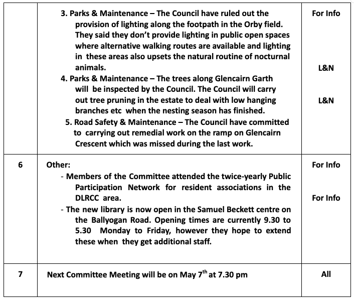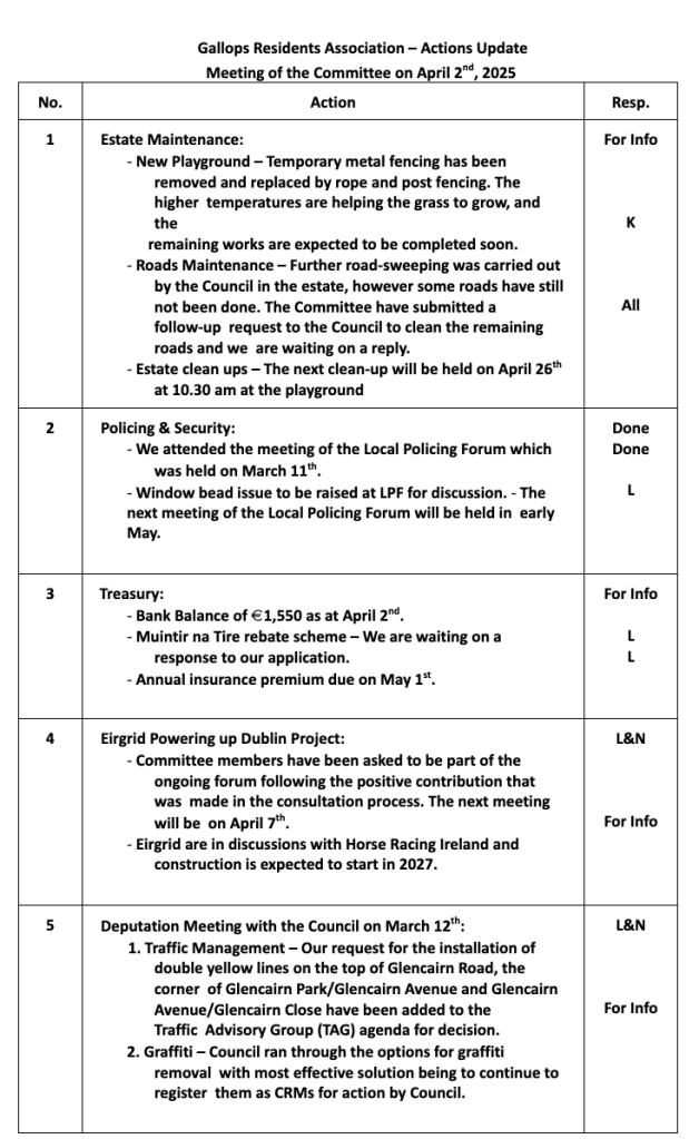 Please see below the Action Plan for April 2025. For a larger file size, click here. Thanks to everyone who donated to the Residents Association. Anyone who would like to contribute can do so by clicking here.