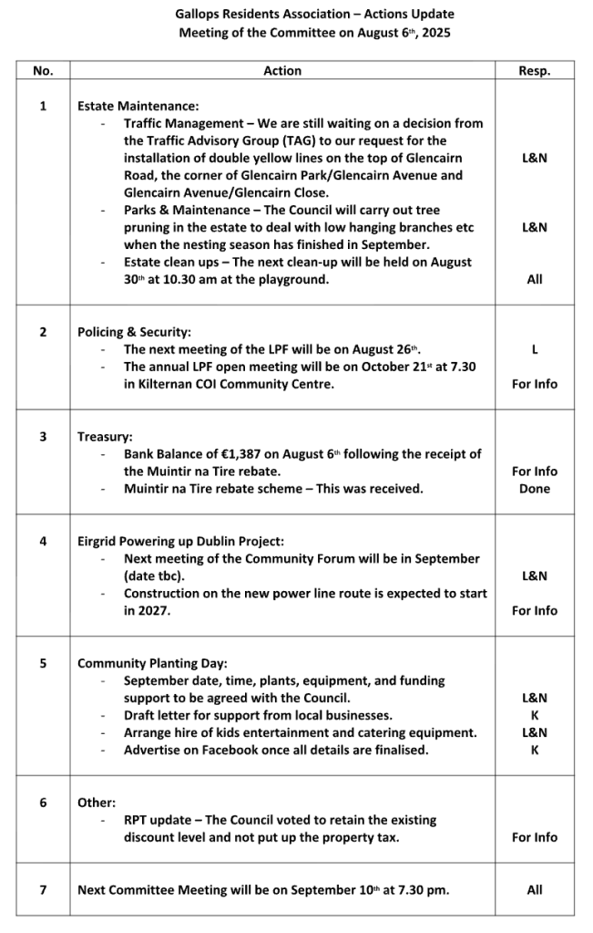 Please see below the Action Plan for August 2025. For a larger file size, click here. Thanks to everyone who donated to the Residents Association. Anyone who would like to contribute can do so by clicking here.