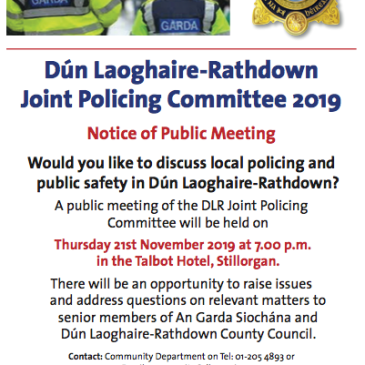 Just a reminder of the DLRCC Joint Policing Forum Public Meeting which takes place tomorrow – Thursday at 7pm in Talbot Hotel Stillorgan.Everybody is welcome!