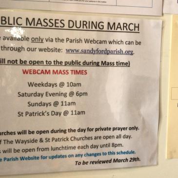 Please note, that mass will be available only via the Parish webcam on sandyfordparish.org (on the bottom right of the webpage) Church will NOT be open to the public during mass times!